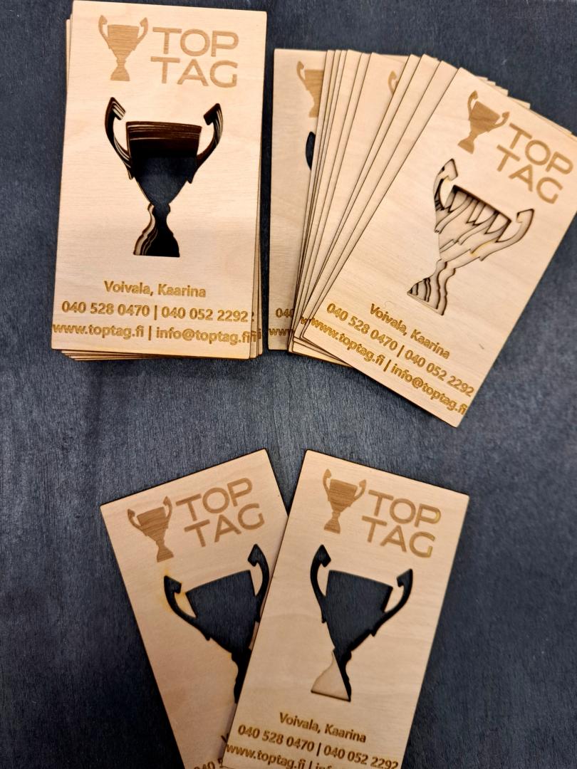 Puiset käntikortit valmistetaan kotimaisesta koivuvanerista. Ota yhteyttä, niin suunnittelemme yhdessä teille näyttävät kortit!